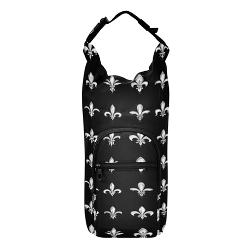 Water Bottle Sling Sleeve Bag, Bottle Carrier Holder Case Cover with Removable Strap Travel Cup Mug Storage with Pockets Silver White Fleur De Lis Design Collection Sets Seamless