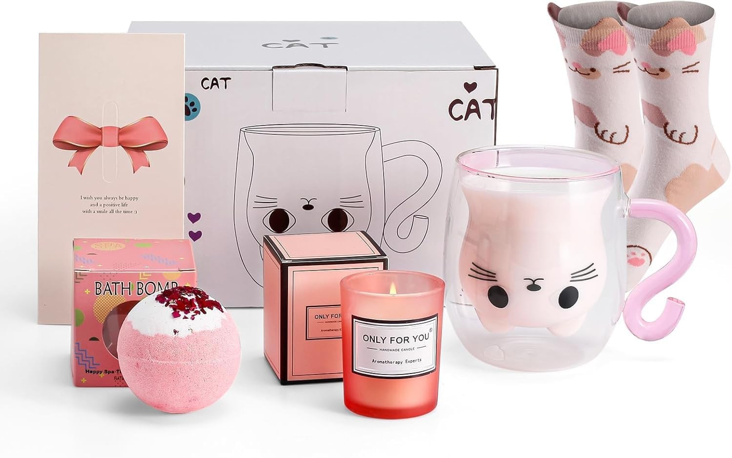 HUISHENG Cat Mug Gift Sets, Birthday Gifts for Women, Presents her, Pink