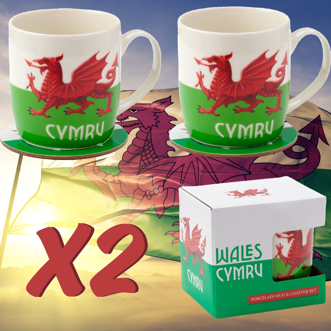 2 X Wales Welsh Dragon Cymru Porcelain Mug & Coaster Sets - Animal Charity Sale