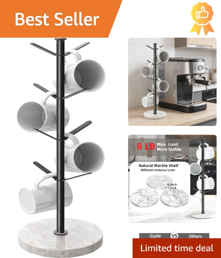 Marble Mug Tree Stand with 8 Hooks, Black Countertop Coffee Cup Holder Organizer