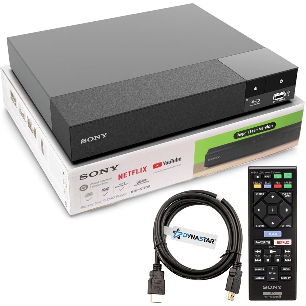 Region Free Blu-ray Player Compatible with Sony BDP-S1700 | Multi-Region Code Free (Blu-ray A B C, DVD REGIONS 0-8) | Full HD 1080p Playback | Dynastar 6FT HDMI included in Bundle
