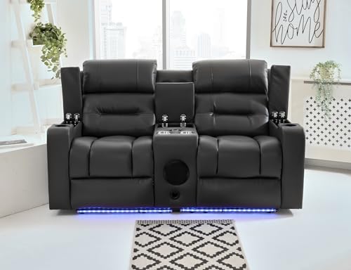 Sofahub Bolero Leather Electric Recliner Sofa for Living Room | LED Power Recliner with Adjustable Headrest, Bluetooth Speakers, Cupholders & USB Port | Home Cinema Sofa (Black, 2 seater)