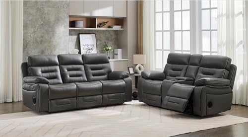 Tech 8 smart 3+2 Electric Recliner Sofa Set, Grey Aire Leather, Multi-Position Recline with Massage & Heat, Bluetooth Speakers, USB-C Charging, Console with Storage, Cup Holders & Tray Table