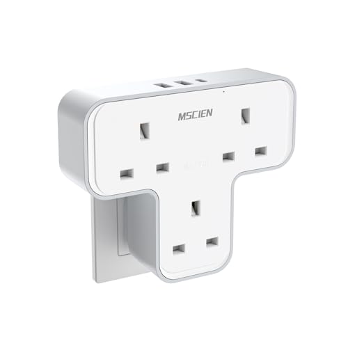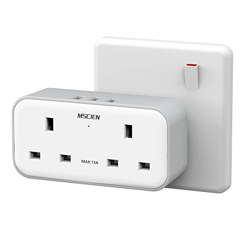 Plug Adapter with 3 USB, Mscien Double Plug Adaptor, Multi Plug Extension, Dual 2 Pin Socket at The Bottom, 13A UK Surge Protected Multiplug Extender, Wall Charger Power Socket for Home Kitchen Office