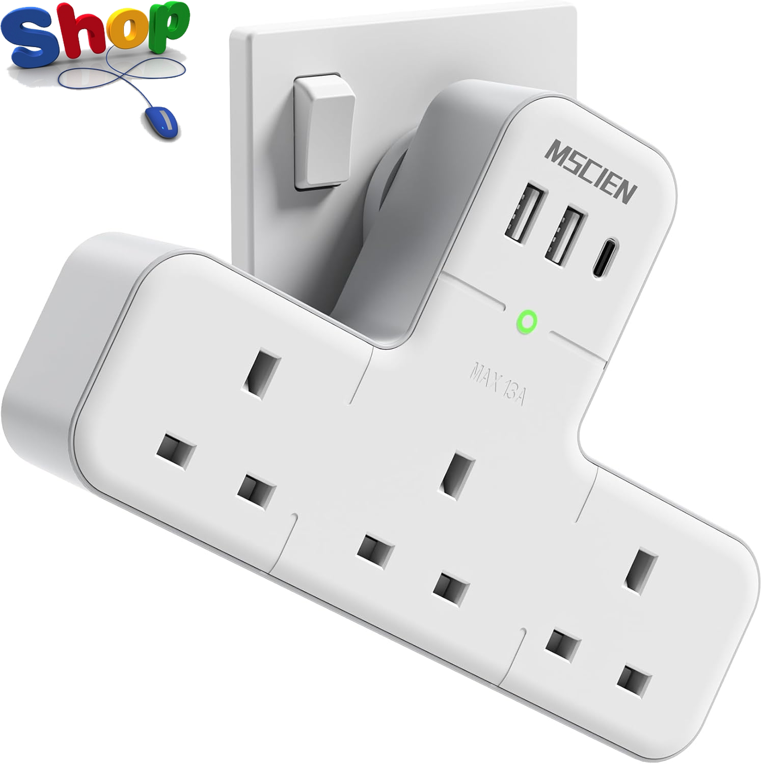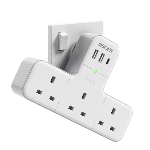 Mscien Multi Plug Adaptor, 6 in 1 Plug Extension Socket 3 Way 3 USB(3.4A,1 Type-C), Wall Socket UK Power Strip with 315 Degree Rotation, Plug Adapter Surge Protected Extender For Home Office