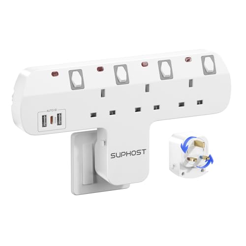SUPHOST Plug Extension Socket, 4 Way Plug Adapter with 180 Degree Rotating UK Plug, 13A Fused Multi Plug Adaptor with 4 Independent Switches, Wall Socket Extension for Home Office Kitchen