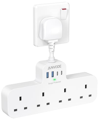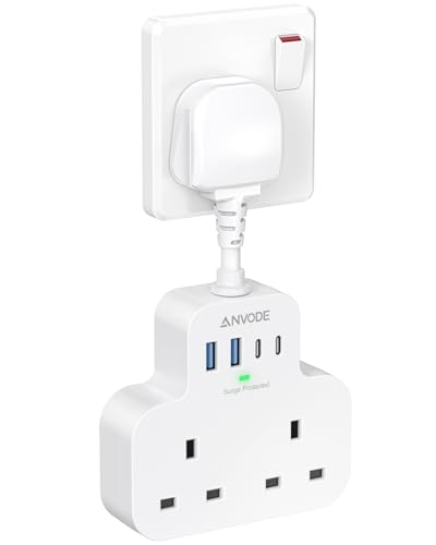 Multi Plug Extension Socket with USB C, ANVODE 3 Way Plug Adaptor with Flexible Socket, Adapter Plug UK Turn 1 to 7, Short Extension Lead Power Strip for Bedroom, Office, Kitchen. White