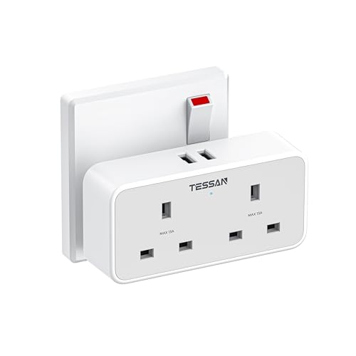 TESSAN Double Plug Adapter UK with 2 USB, 2 Way Multi Plugs Extension Socket, 13A UK Dual Surge Protected Wall Charger Power Adaptor for Home, Office, Kitchen, School Supplies