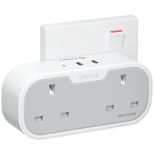 Double Plug Adaptor, VINTAR Multi Plug Extension Socket with 2 USB 1 USB C Ports, 2 Way Plug Adapter UK, 13A UK 3 Pin Wall Multiplug Extender for Bedroom, Office, Kitchen, 1 pack
