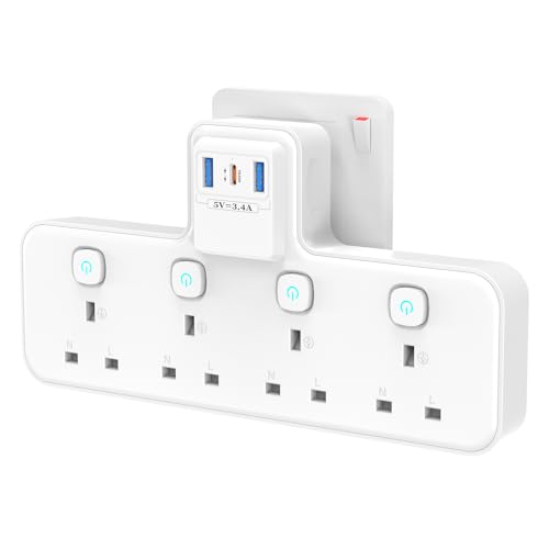 Plug Extension Socket, Multi Plug Adaptor 4 Way with Individual Switches, Adapte