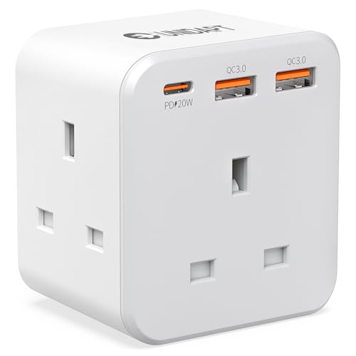 Unidapt 3 Way Plug Adaptor with 3 Fast Charge Ports, Multi Plug Extension with PD 20W USB-C and 2 USB-A QC 3.0, 13A UK Plug Extender Socket, Triple Plug Adapter, Wall Power Cube for Home Office
