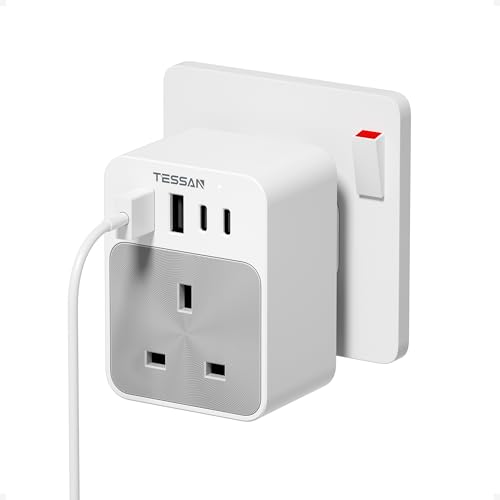 TESSAN USB C Plug Adaptor UK, Multi Plug Extension Socket with 4 USB Charger, 1 Way Wall Charger Sockets 3250W, Power Adapter for Home, Kitchen, Office, School Supplies
