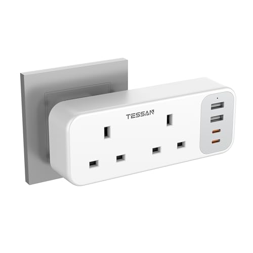 Double Plug Adaptor UK with 4 USB(2 USB C), TESSAN 2 Way Multi Plug Extension Socket, 13A Fuse UK Multiplug Adapter Power Extender for Home, Kitchen, Office, School Supplies