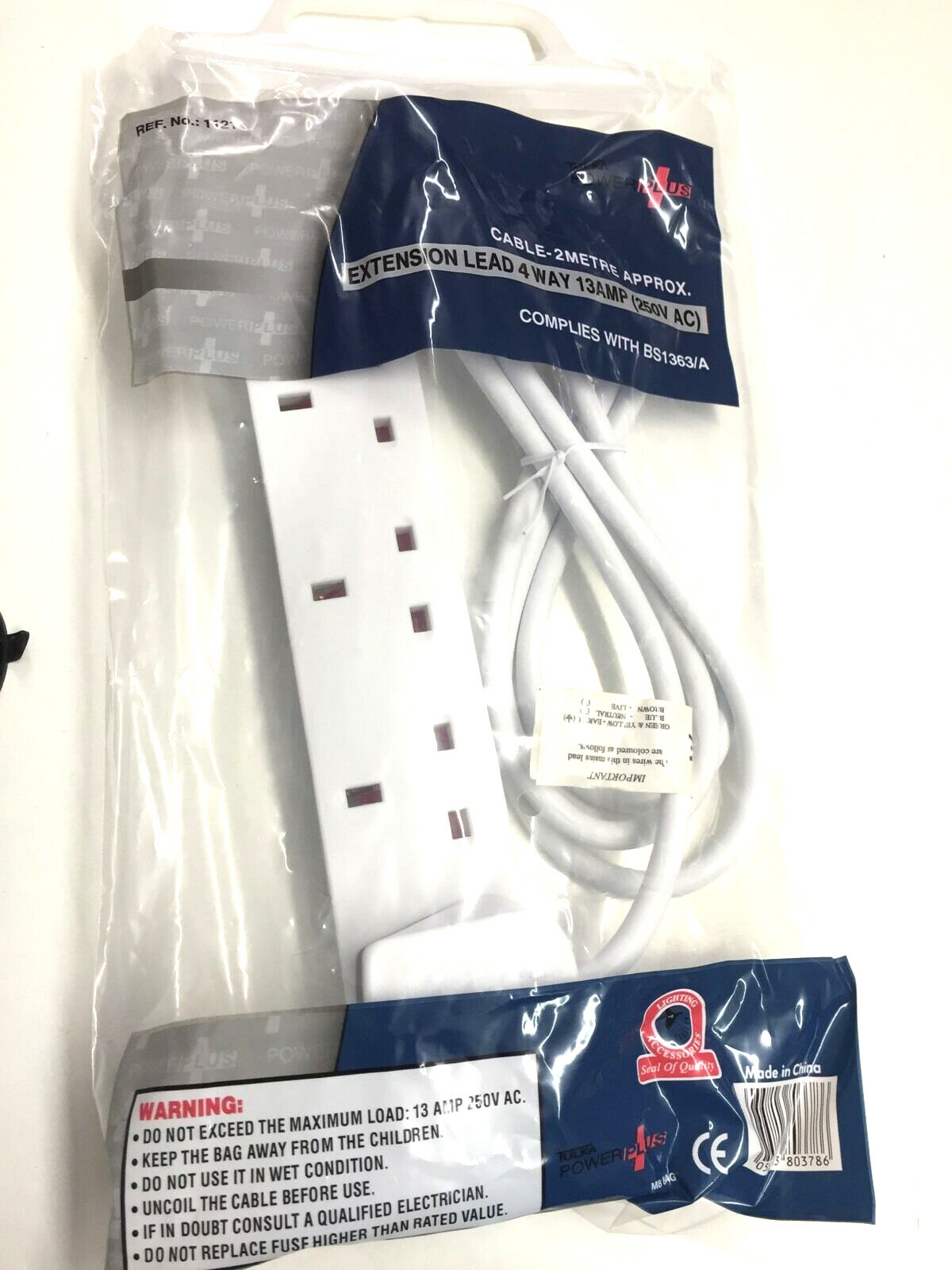 4 Way Gang 2M Extension Lead 13A White Plug Socket Power Adaptor Multi Plug
