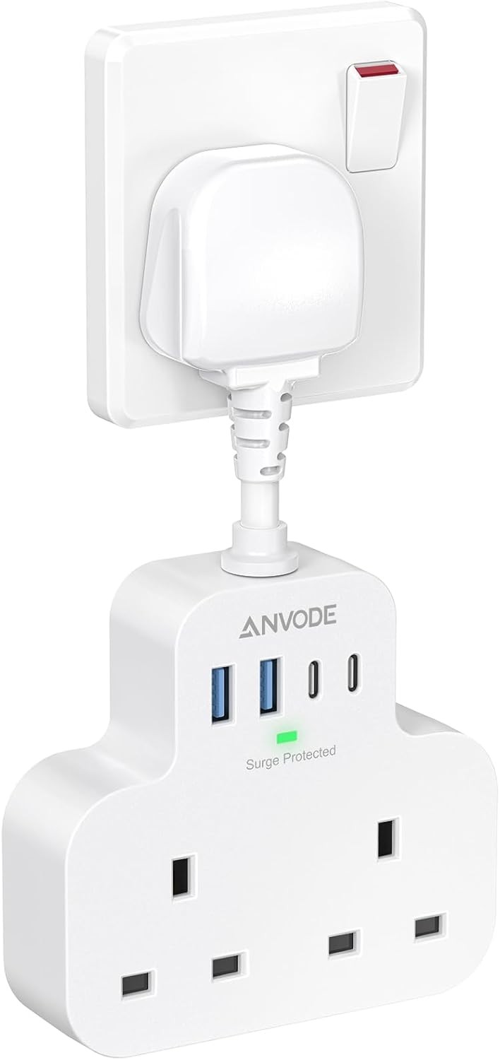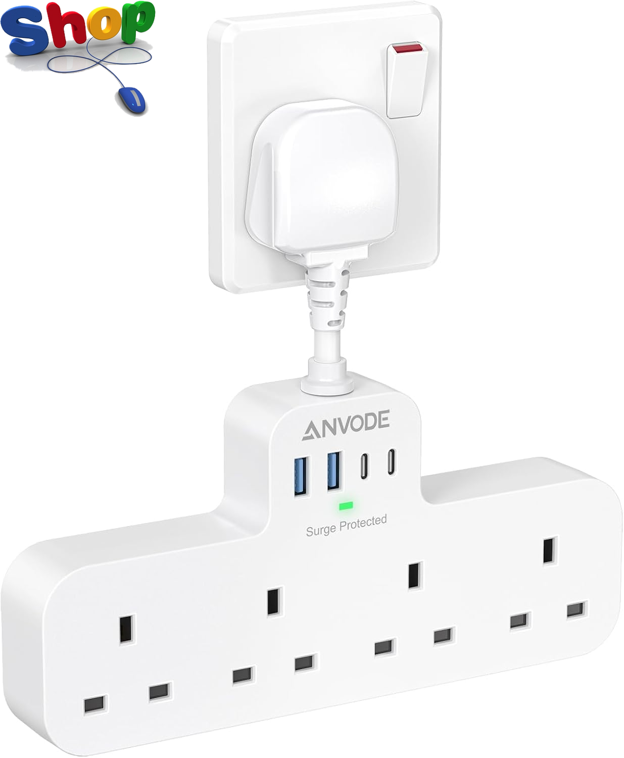 Multi Plug Extension Socket with 4 USB Ports, ANVODE 2 Way Plug Adaptor with Fle