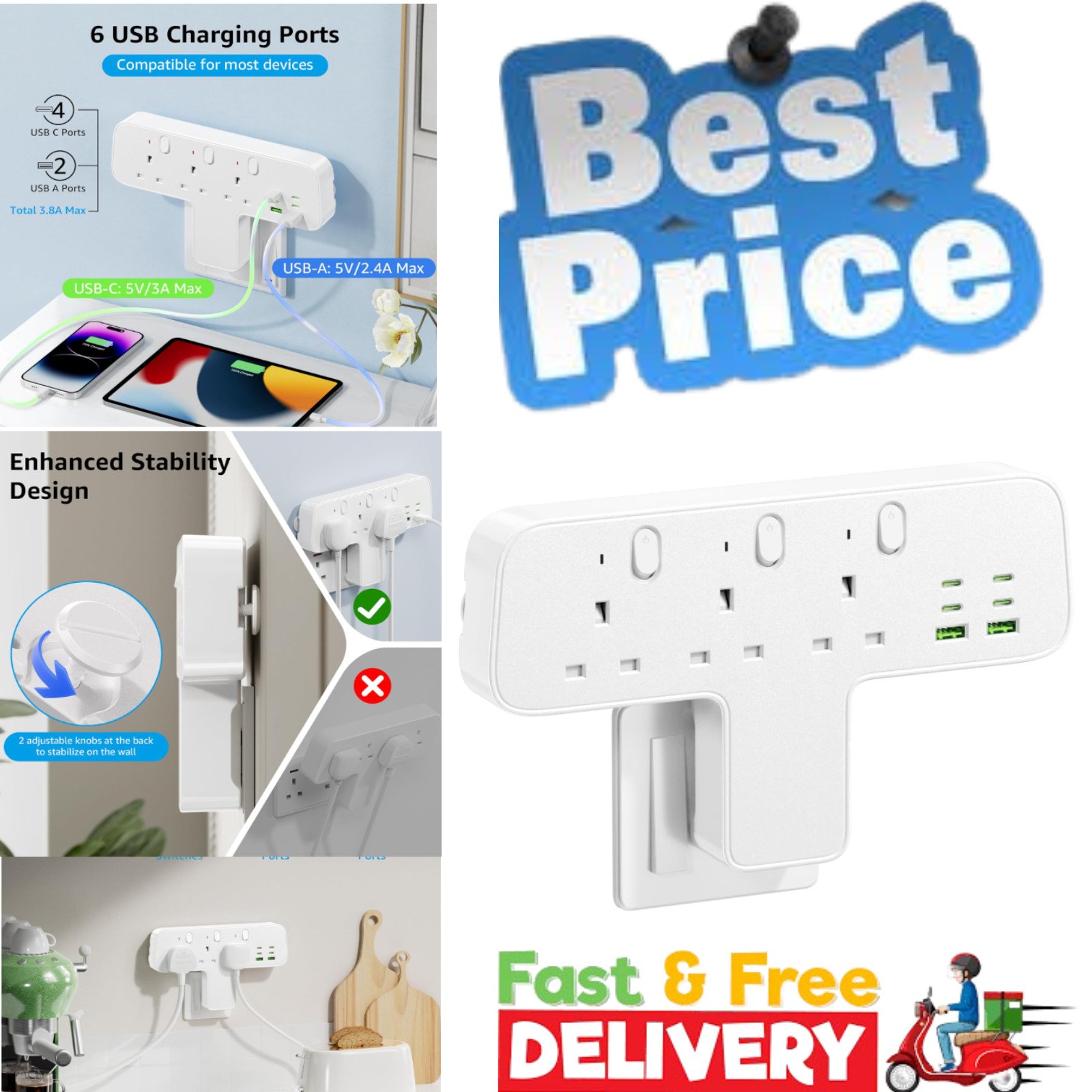 Mscien Multi Plug Adaptor, 6 in 1 Plug Extension Socket 3 Way 3 USB(3.4A,1 Type-