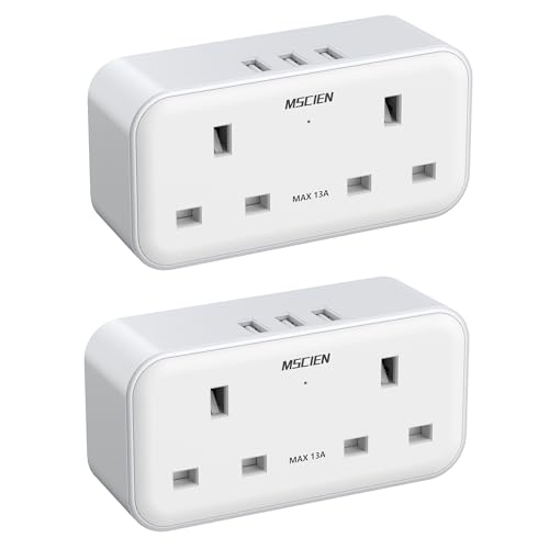 Plug Adapter with 3 USB (2 Pack), Mscien Multi Plug Extension Socket, Double Plug Adaptor with Dual 2 Pin Socket at The Bottom, 13A UK Multiplug Extender, Wall Charger Power Socket for Home Office