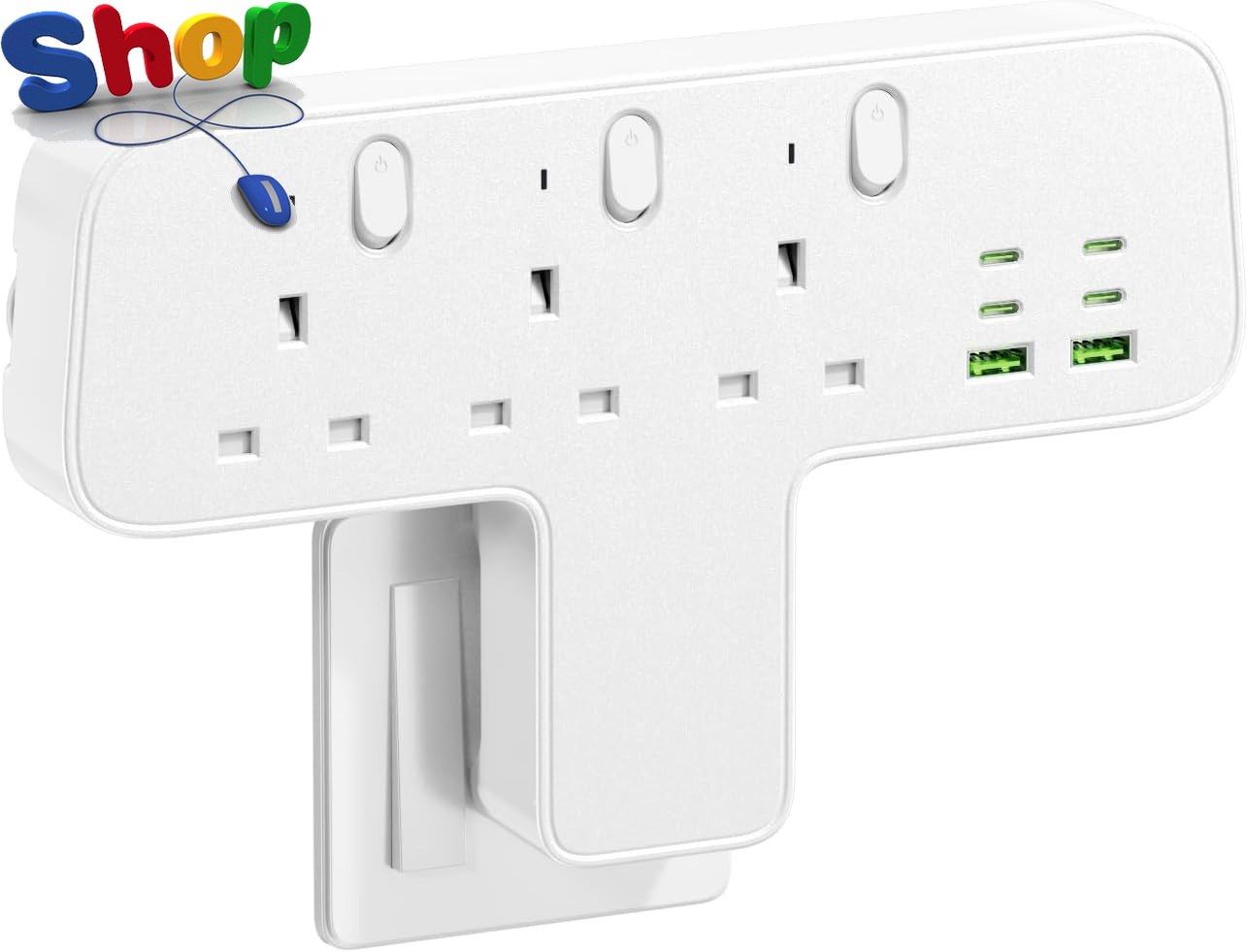 Multi Plug Extension Socket with USB C, 3 Way Plug Adaptor With Nightlight, Sho