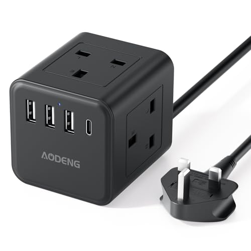 Extension Lead with 4 USB Slots, 4 Way (13A/3250W) Multi Plug Extension Cable, UK Desktop Power Extension Cord with Multi Socket, 1.5M Extension Cable (black, 5M)