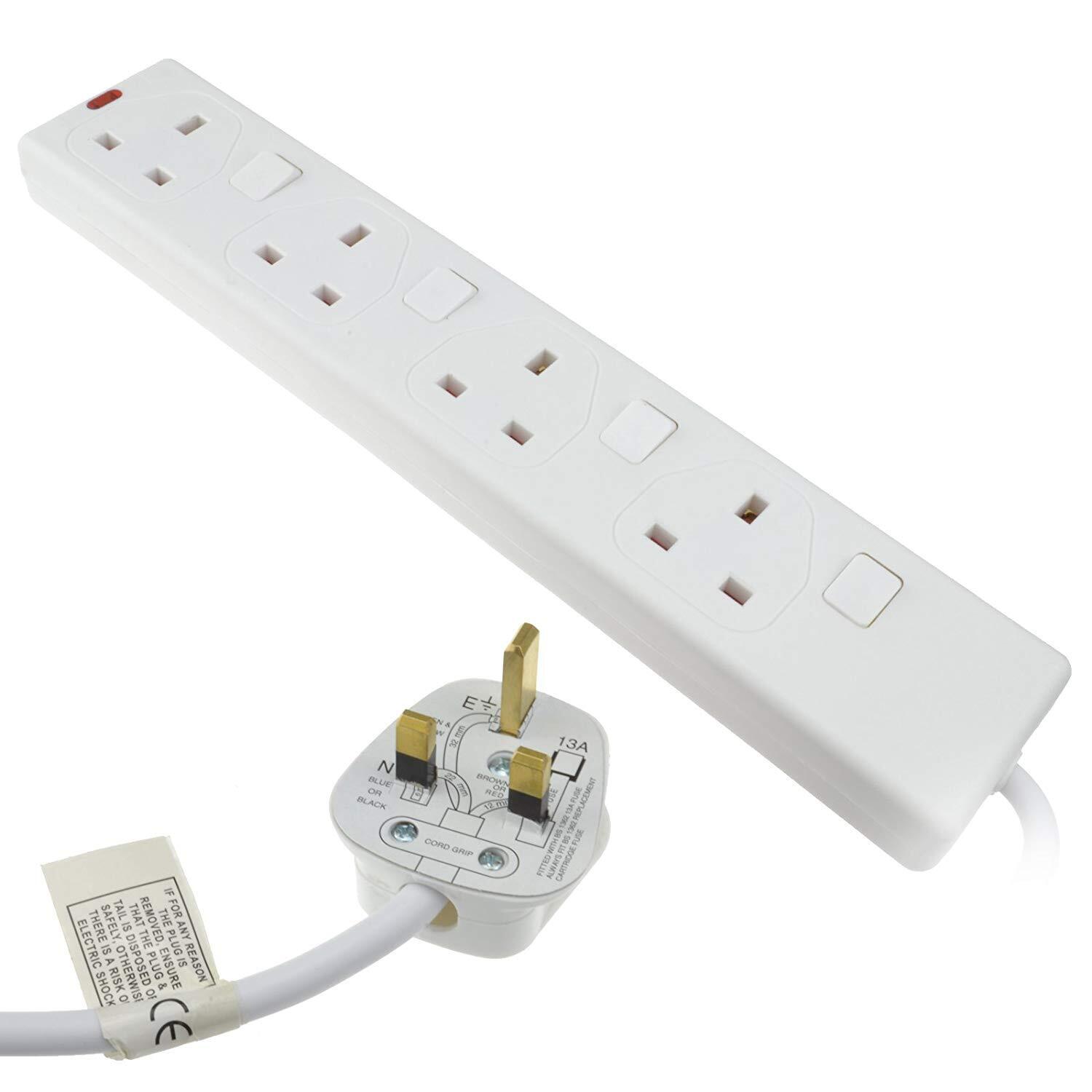 4 Way Gang UK Multi Socket UK Plug Extension Cable Free Mains Adaptor 13A white