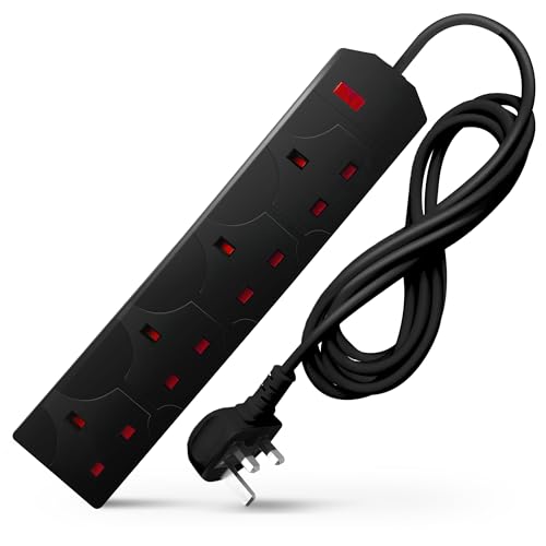 LIPWEL Extension Lead Plug Extension Cord Black Power Strip 4 Way Socket Multi Plug 1m 2m Extension Electric Cable Multi Socket Plug Adapter PC Accessories with Indicator for Multiple Devices
