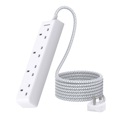 3M 4 Way Extension Lead, HANYCONY Plug Extension Socket with Braided Cable, Heavy Duty Power Strip 13A 3250W, Multi Socket Adapter for Home, Office, Living Room, Camping Essentials, White