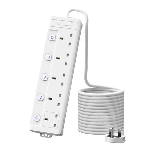 5M Extension Lead, MSCIEN Long 5 Metre 5 Gang Power Strip with Wall Mounted, White, Multi Socket with Individually Switches Plug Extension for Home Dorm Office