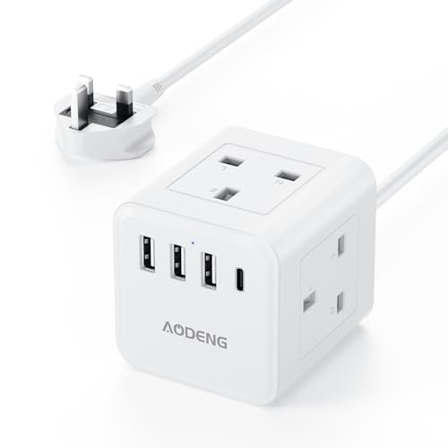 Extension Lead with 4 USB Slots, 4 Way (13A/3250W) Multi Plug Extension Cable, UK Desktop Power Extension Cord with Multi Socket, 1.5M Extension Cable (white, 5M)
