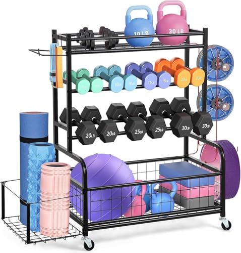 WUDLEP Dumbbell Rack Stand, Multifunctional Weight Rack with Multi-Direction Wheels, Dumbbell Stand for Home Gym with Hooks, Yoga Mat Storage Rack for Dumbbells, Kettlebells, Yoga Mats, Yoga Bricks