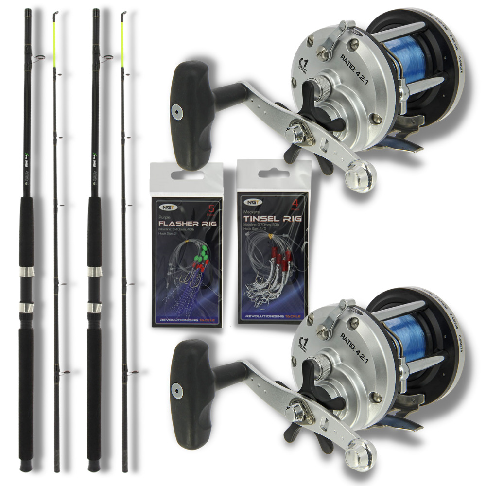2 x BOAT FISHING RODS 6ft AND MULTIPLIER REELS SET WITH SEA FISHING FEATHERS NGT