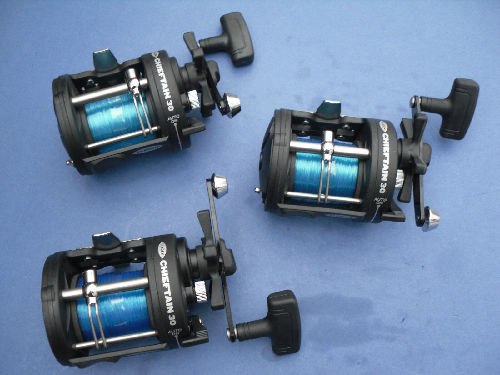 3 X FLADEN CHIEFTAIN 30 MULTIPLIER REELS WITH LINE ON BOAT SEA FISHING TACKLE