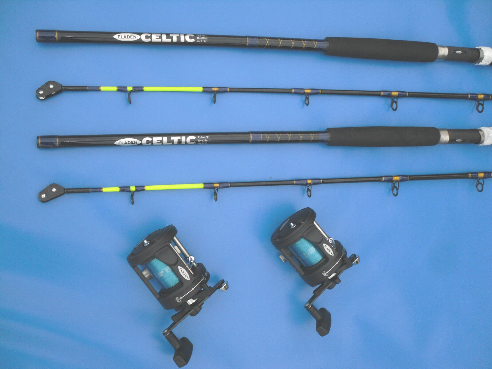NEW 2 FLADEN WARBIRD 7ft CARBON BOAT RODS+2 CHIEFTAIN 30 MULTIPLIER REELS+LINE