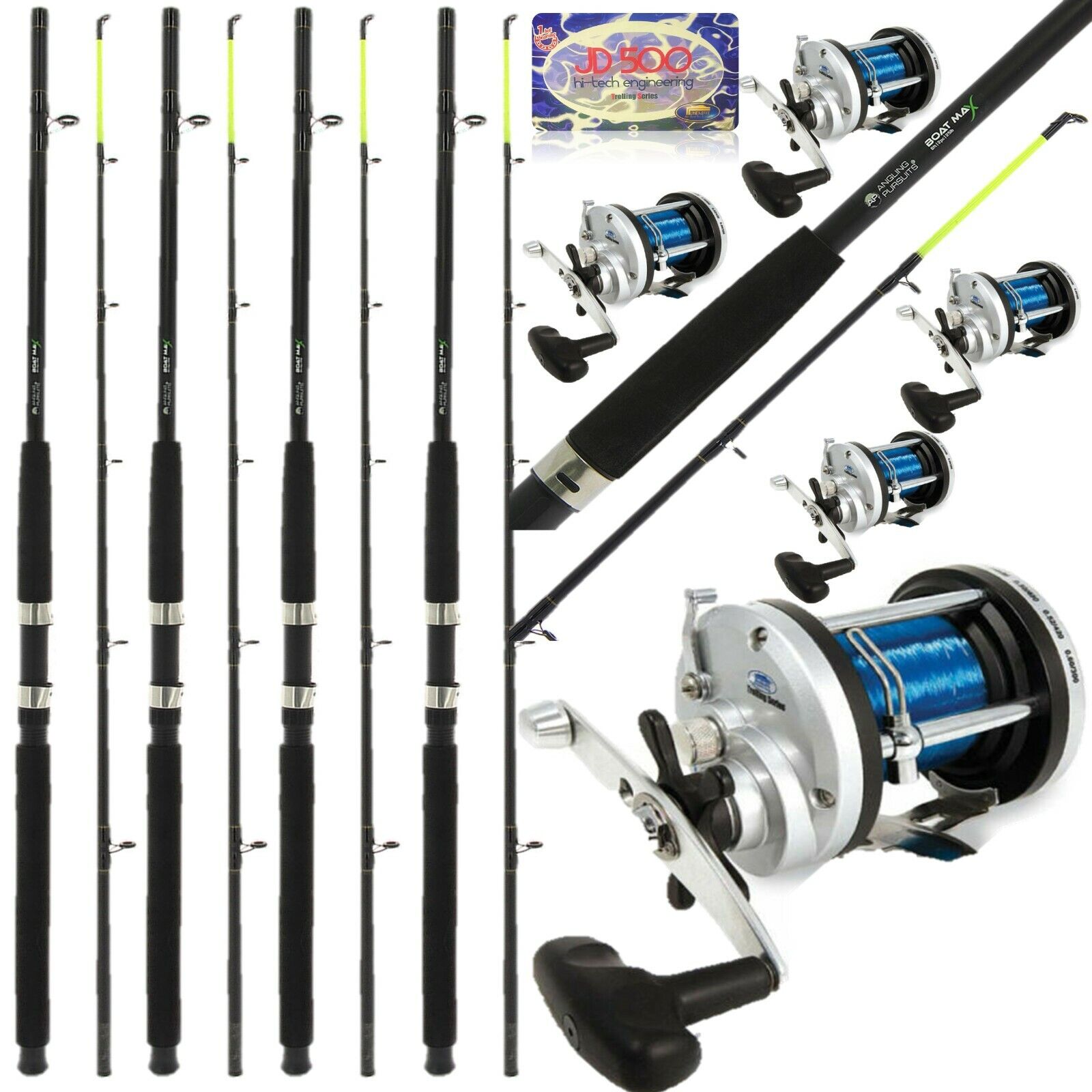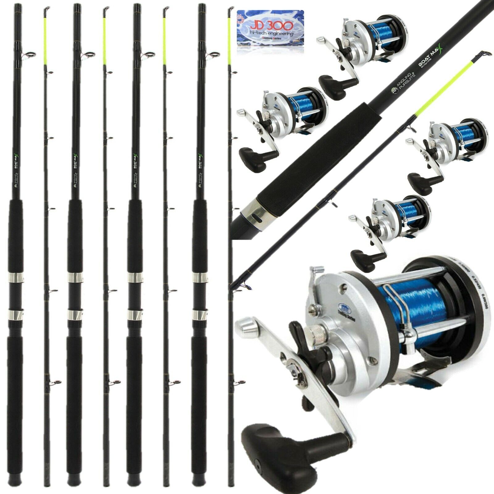5 Sea Fishing Boat Max Rods 6FT Yellow Tip + JD300 Multiplier Reels 20lbs Blue