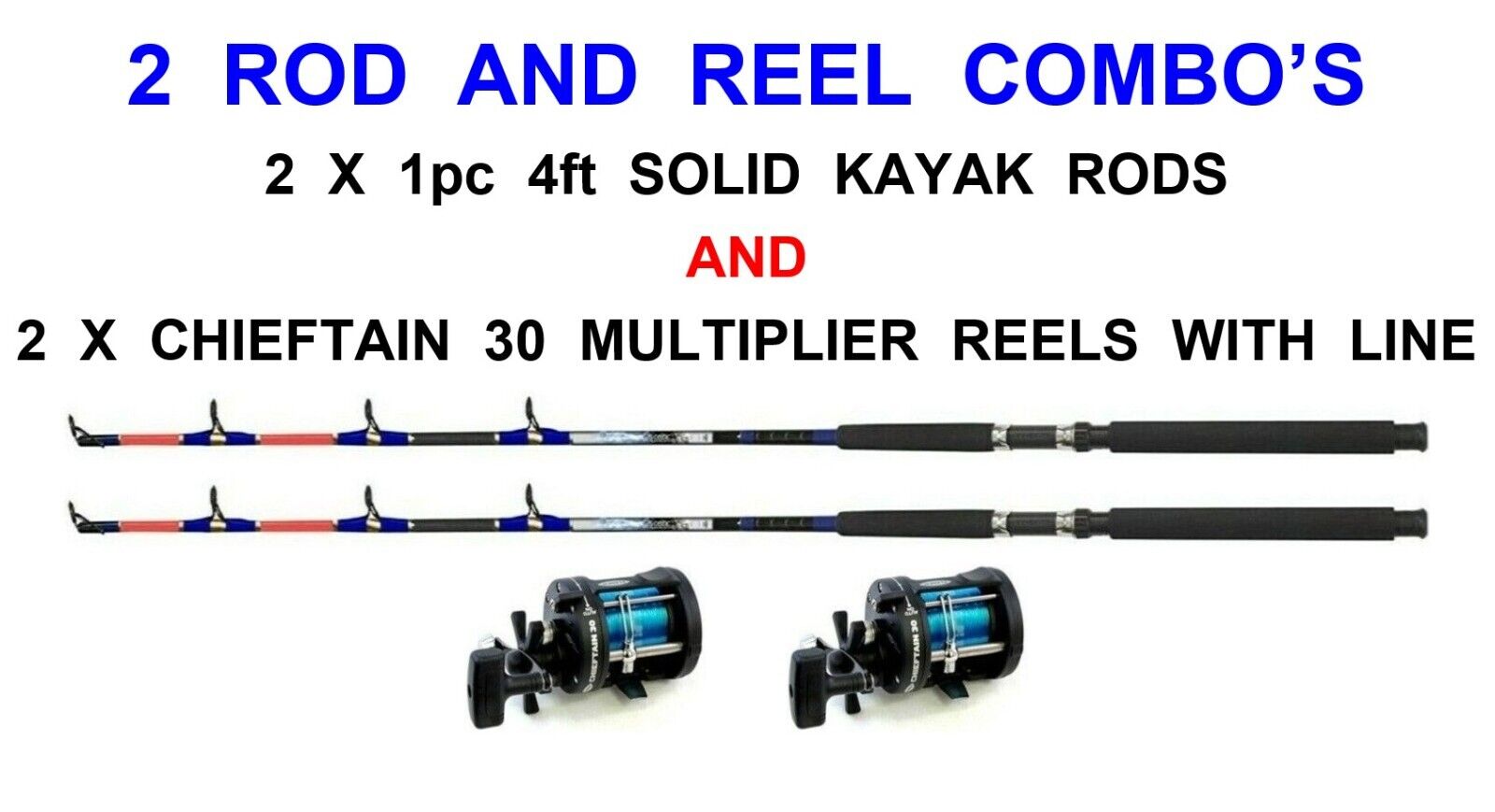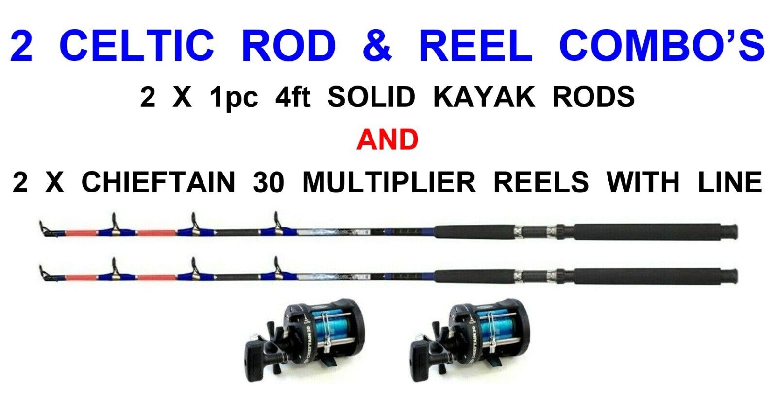 2 CELTIC 4ft SOLID KAYAK RODS+CHIEFTAIN 30 MULTIPLIER REELS+LINE BOAT FISHING