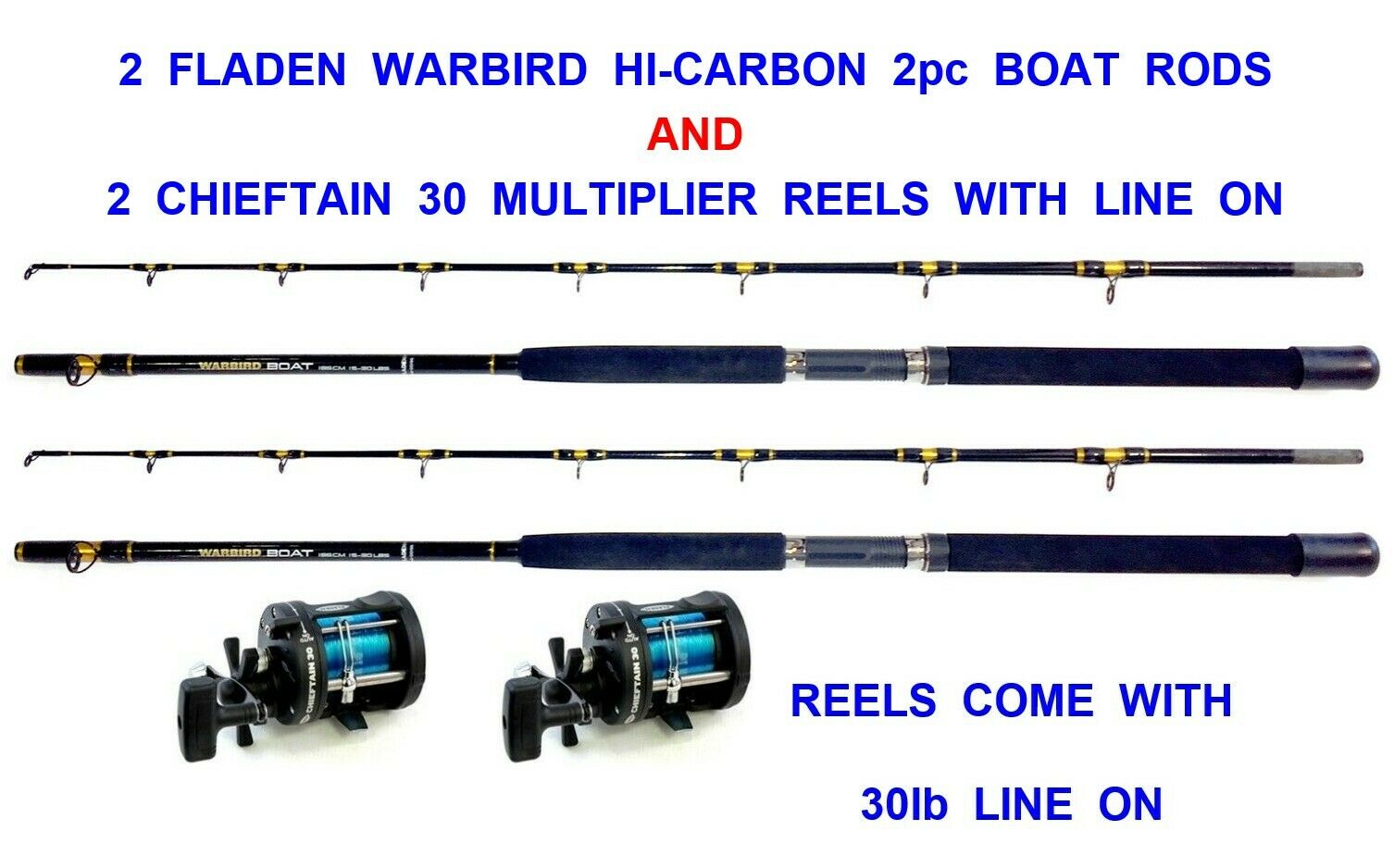 NEW 2 FLADEN WARBIRD 6ft CARBON BOAT RODS+2 CHIEFTAIN 30 MULTIPLIER REELS+LINE