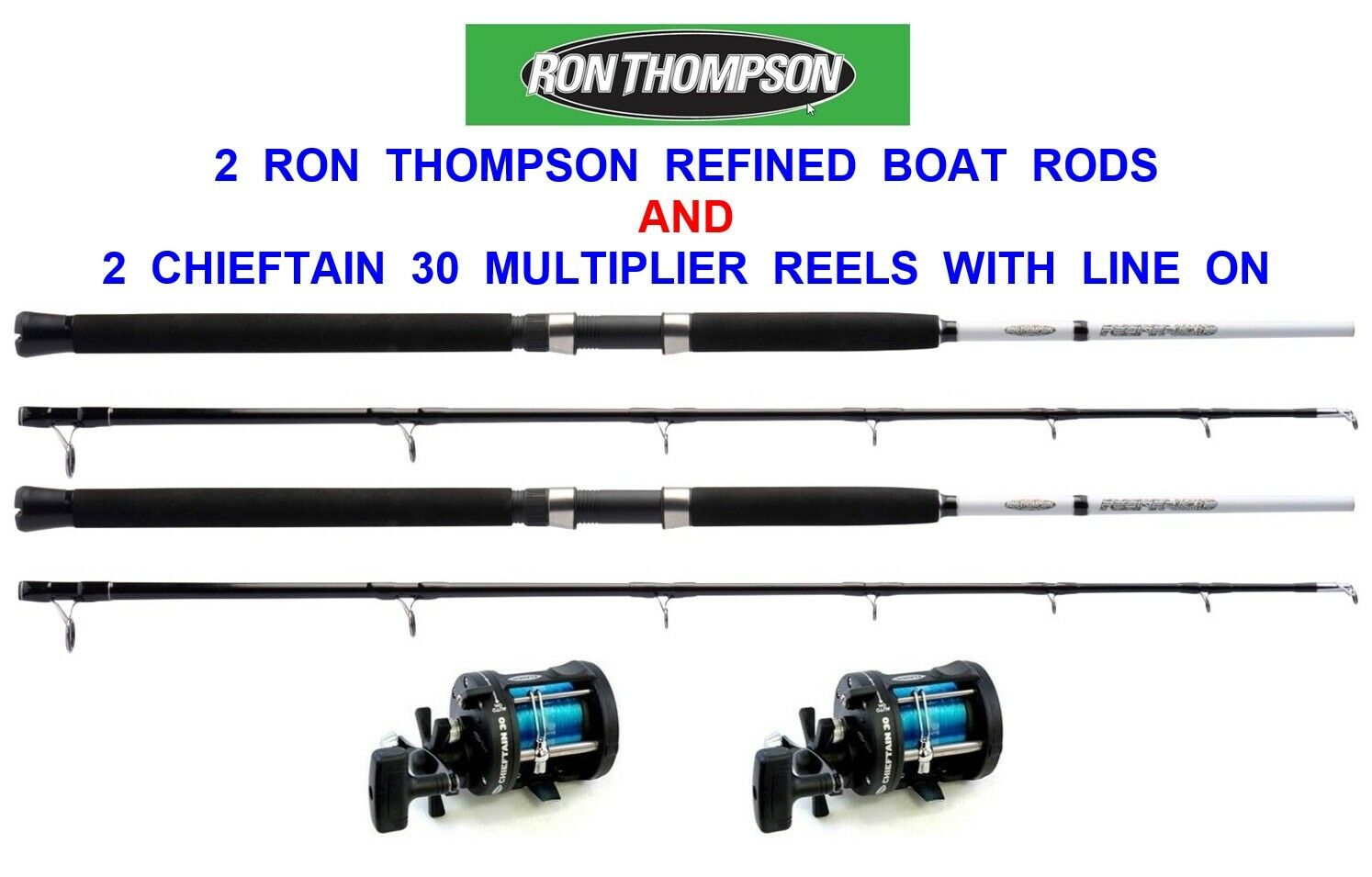 2 RON THOMPSON REFINED 6ft BOAT RODS & 2 CHIEFTAIN 30 MULTIPLIER REELS WITH LINE