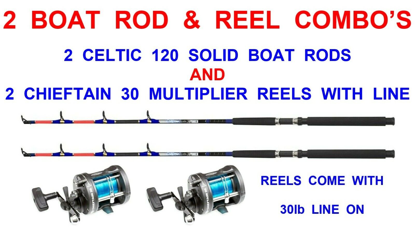 2 CELTIC 120 SOLID BOAT RODS+CHIEFTAIN 30 MULTIPLIER REELS+LINE KAYAK FISHING
