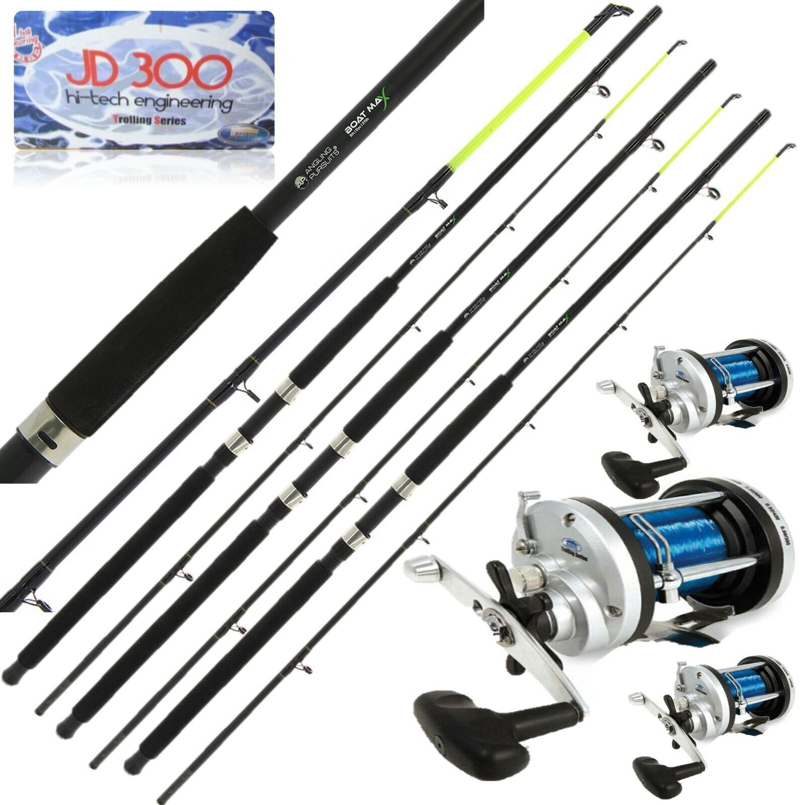 3 Sea Fishing Boat Max Rods 6FT Yellow Tip + JD300 Multiplier Reels 20lbs Blue