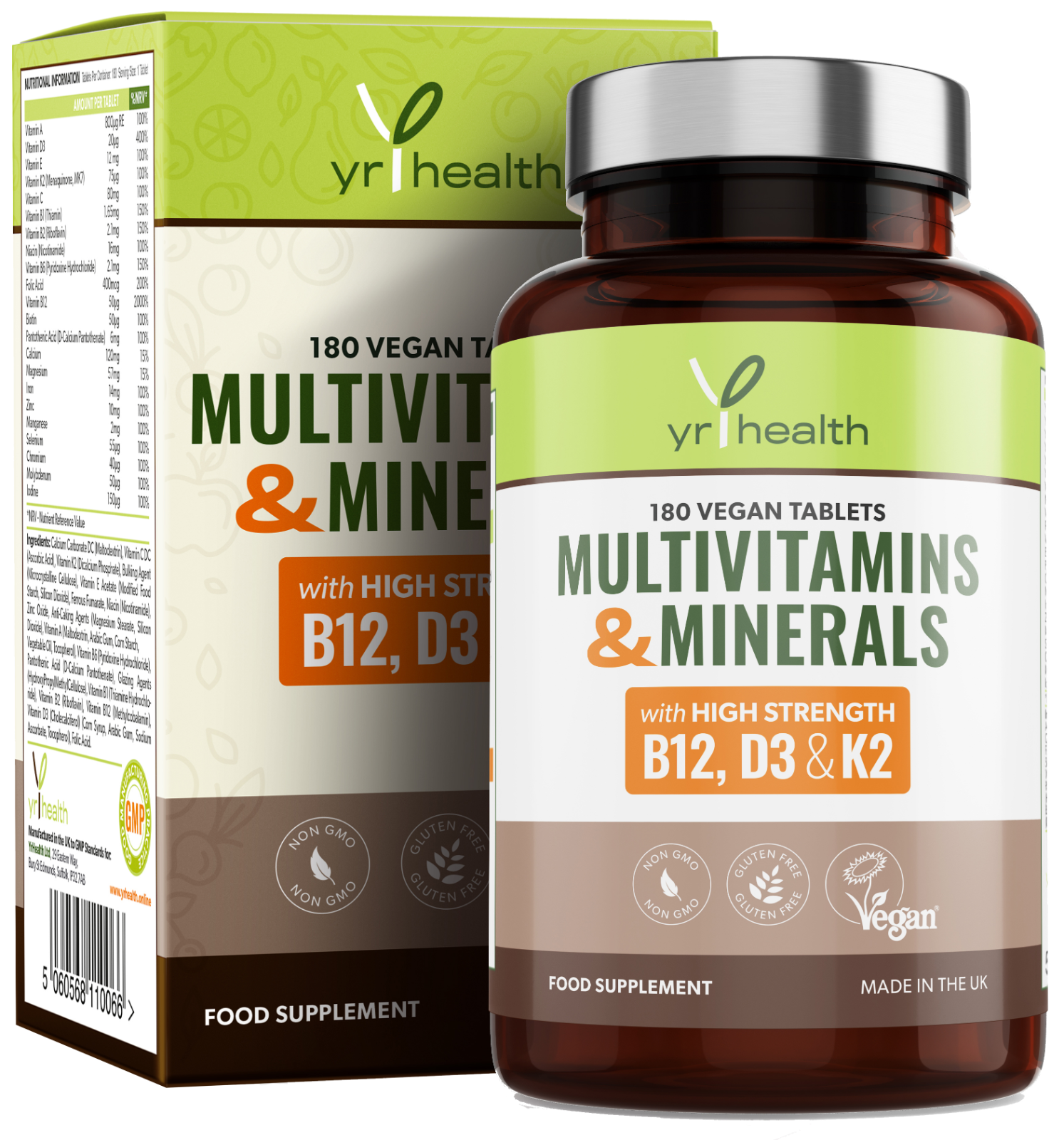 Vegan Multivitamins & Minerals with Vitamin B12, D3 & K2, Zinc and Iron, 180 Vegan Society Registered Tablets for Men and Woman, 6 Month Supply - Made in The UK by YrHealth