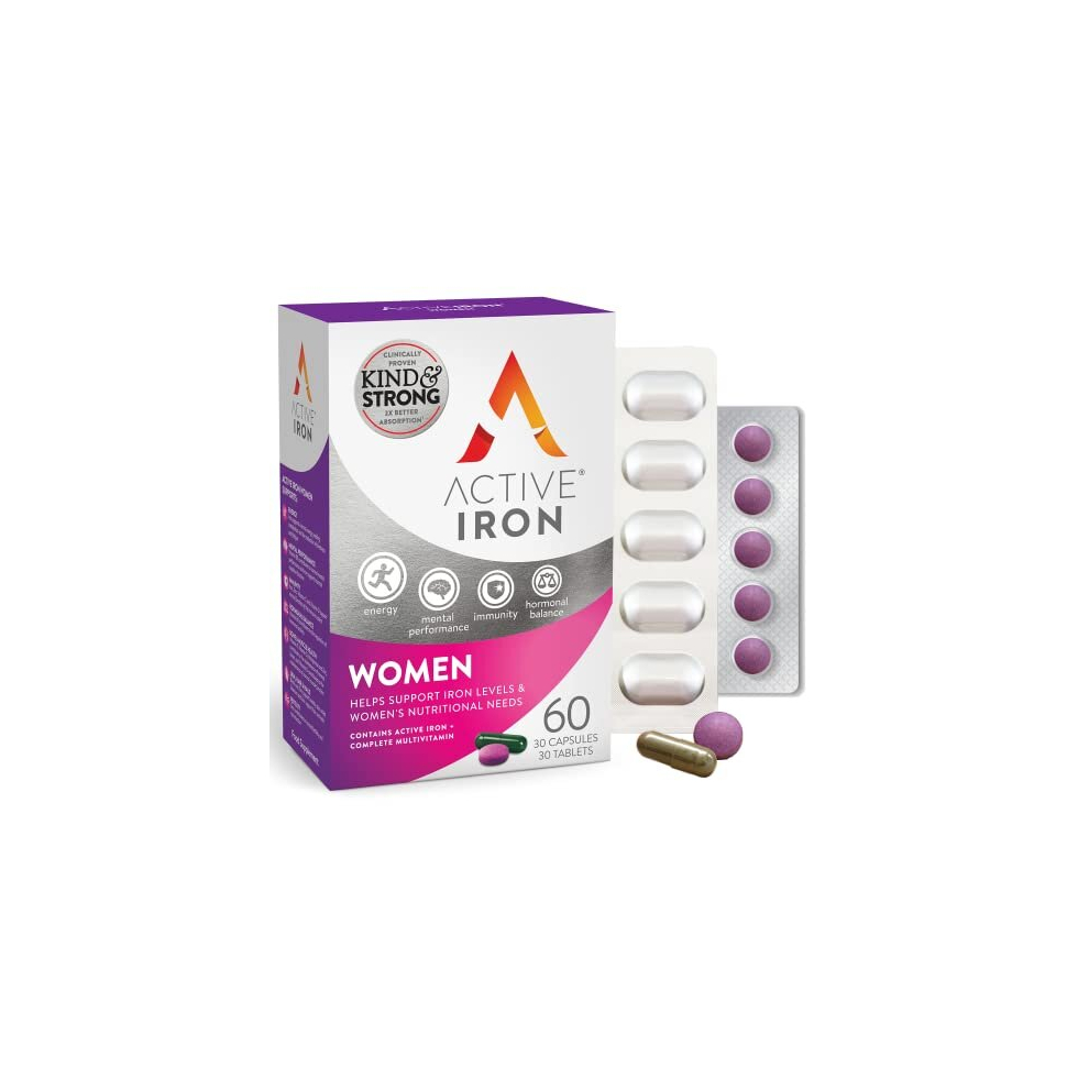 Active Iron Women with Active Multivitamin | 30 Iron Capsules & 30 Active Multivitamins | Iron Supplement | High Strength B Vitamins |