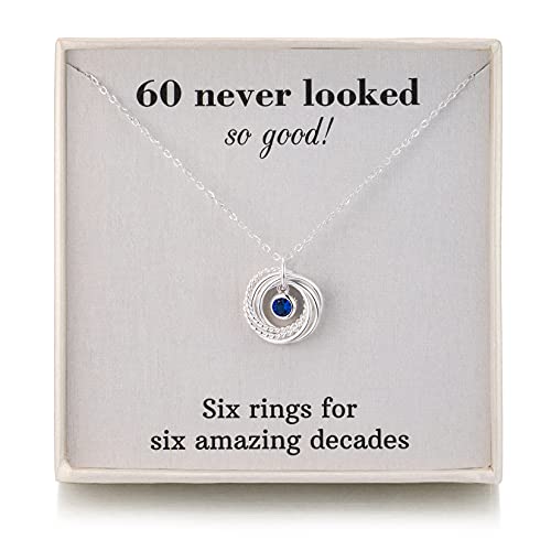 RareLove 60th Birthday Gifts for Women Jewellery,925 Sterling Silver 6 Rings Sapphire Birthstone Necklace,60 Birthday Gifts for Mum Best Friends,Six Rings for Six Decades