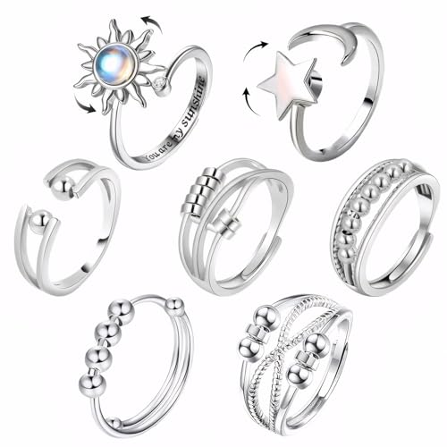 LINXINS 7Pcs Fidget Rings, Sterling Silver Anxiety Ring for Women, Adjustable Open Spinner Rings, Fidget Jewellery for Mum Girlfriend Daughter - Anxiety Relief Gift