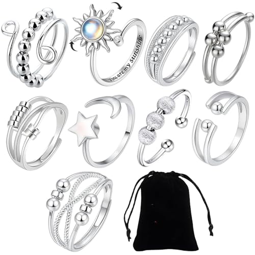 9Pcs Fidget Rings, Fidget Rings for Anxiety Women, Sterling Silver Anxiety Ring for Women, Adjustable Open Spinner Rings, Fidget Jewellery for Mum Girlfriend Daughter - Anxiety Relief Gift