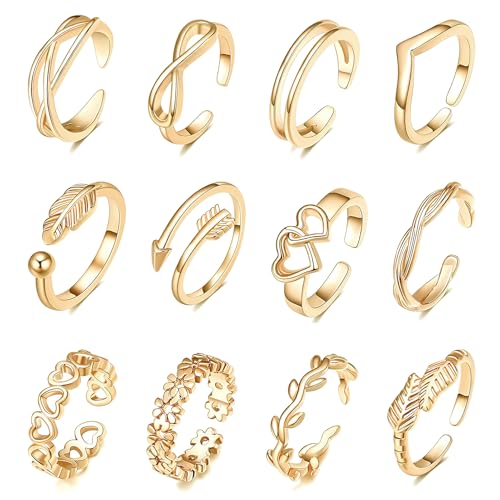 CKDSA 12PCS Adjustable Gold Plated Toe Open Rings for Women Girls Stackable Finger Jewellery Gold Knuckle Rings Floral Heart Arrow Patterns Summer Beach Foot Jewelry Birthday Gifts for Mum Ladies