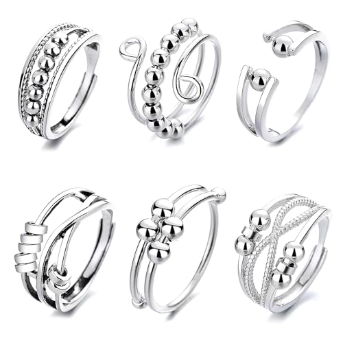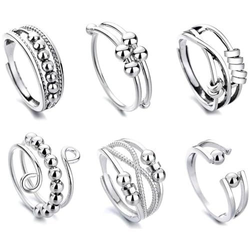 6PCS Anxiety Rings for Women Girls Silver Fidget Ring Stress Reliever Ring Adjustable Open Spinner Bead Anxiety Rings, Autism Sensory Anxiety Reliever Jewelry, Gifts for Mum Girlfriend Daughter
