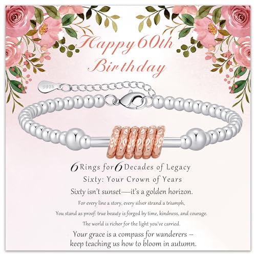 BMMYE 60th Birthday Gifts for Women, Sterling Silver Bracelet with Rose Gold Rings Adjustable Silver Beaded Bracelet with Birthday Cards Gifts for Women Sister Friends Mum Grandma