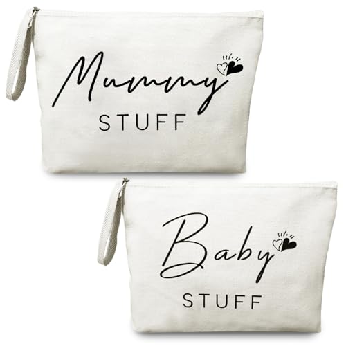 YNR 2 Pcs Portable Baby Shower Gifts for Mum, Canvas Pouch Bags with Zipper, New Mum Gifts, White Cosmetic Bags, Mother to Be Present