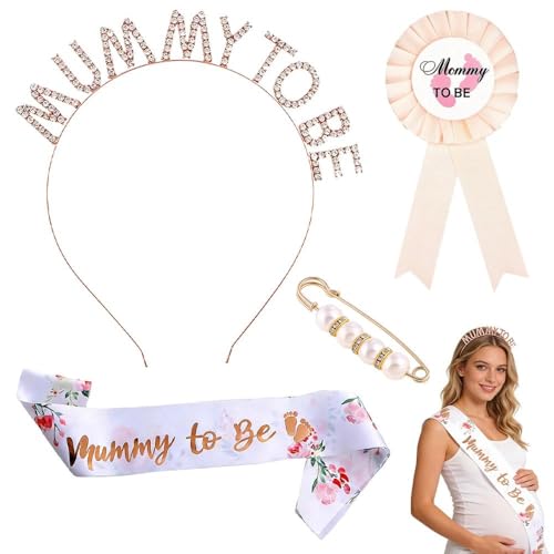 Mummy to Be Sash, 4PCS Mum to Be Sash Set Include Mummy Sash, Crown Headband, Badge and Pin, Baby Shower Party Decoration & Maternity Gifts for Expecting Mum