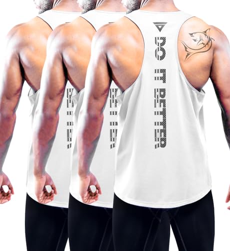 Boyzn 3 Pack Muscle Tank Top for Men, Dry-Fit Y-Back Gym Workout Muscle Tee Shirts, Quick Dry Athletic Training Vest Tops, Summer Breathable Fitness Bodybuilding Sleeveless T-Shirts White-3P08-L