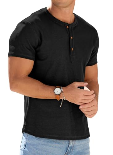 PrinStory Men's Henley T-Shirts Cotton Short Sleeve Tops Casual Summer Muscle Slim Fit Tee For Men Gym Golf Activewear (Black, XL)
